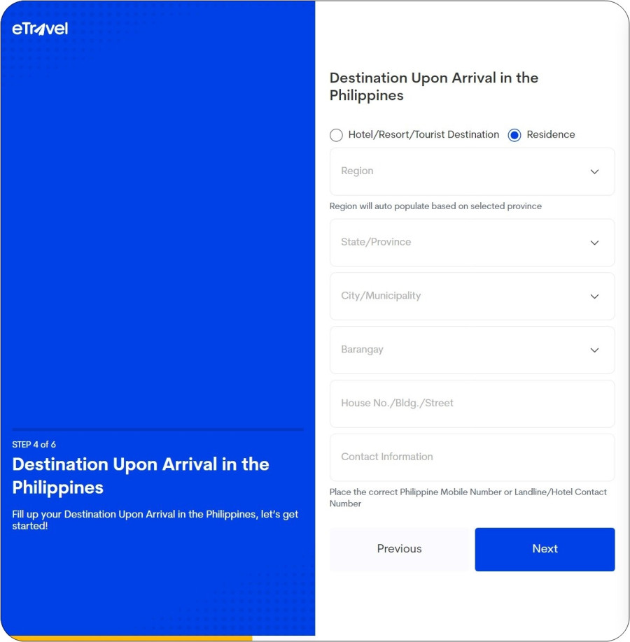 호텔이나 리조트에 묵는 경우 Hotel/Resort/Tourist Destination 부분을 선택하시고 호텔명만 적으면 자동으로 행정구역이 입력되어서 큰 문제가 없지만, 호텔이 아닌 곳으로 가시는 경우는 Residence를 선택하고 주소를 적어야 하는데 행정구역에 맞추어 적도록 해두어서 필리핀 내 체류 주소를 적기가 쉽지 않습니다. 그냥 주관식으로 주소를 쭉 적도록 하지 않고 Region과 Province 등으로 나눠서 적게 되어 있어서 필리핀의 행정구역에 대해 전혀 모르는 상황에서 보면 이게 뭔가 싶은 생각이 들 정도입니다. 하지만 그렇다고 방법이 없는 것은 아닙니다! 좀 더 쉽게 주소 부분의 채우는 비법을 알선해 드리고자 합니다.